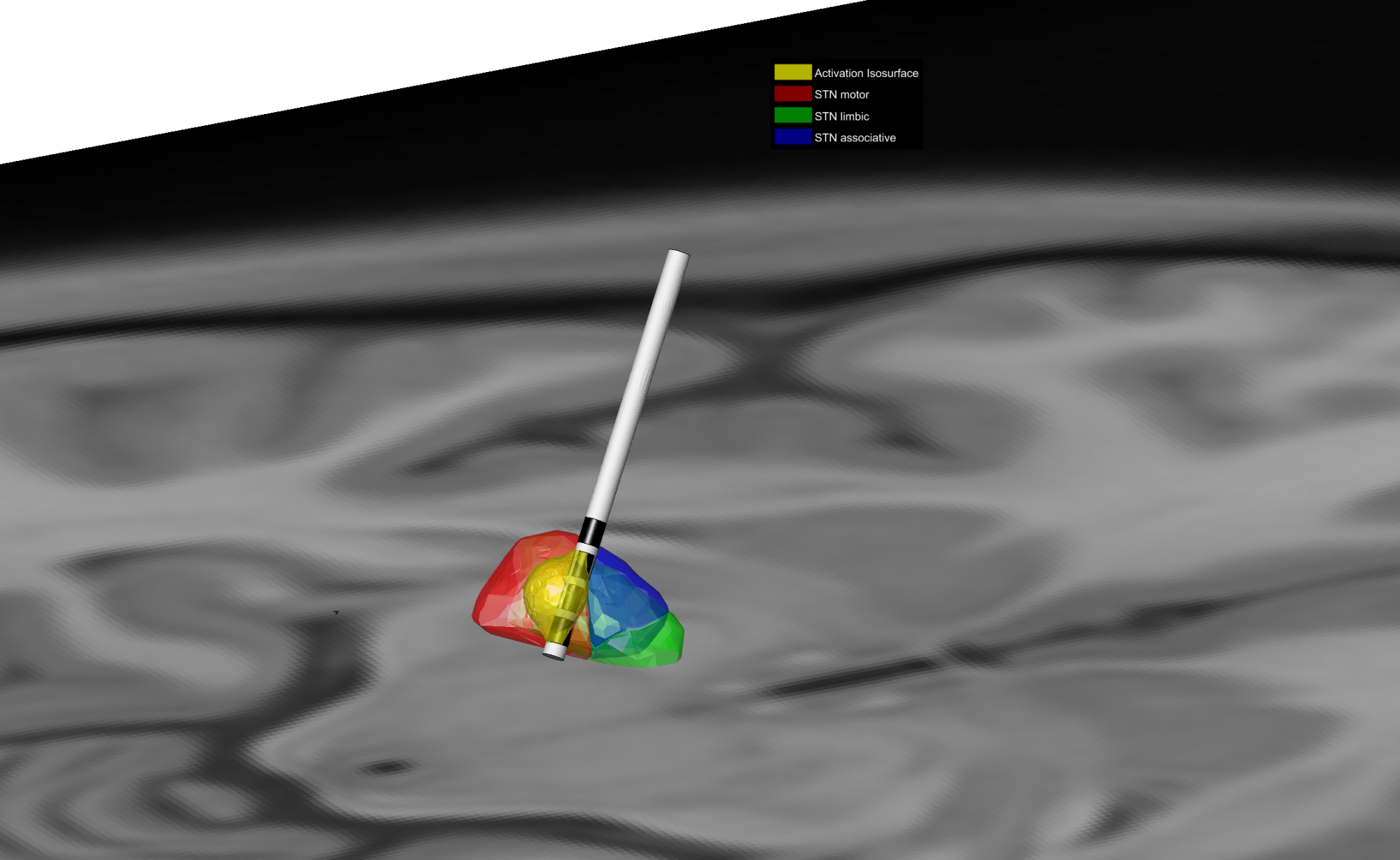 This image demonstrates the optimized activation field in Deep Brain Stimulation targeting the subthalamic nucleus (STN) motor region in Parkinson’s Disease (PD). By optimizing the electric field to precisely target the STN motor, the motor symptoms of PD are addressed while minimizing potential side-effects.